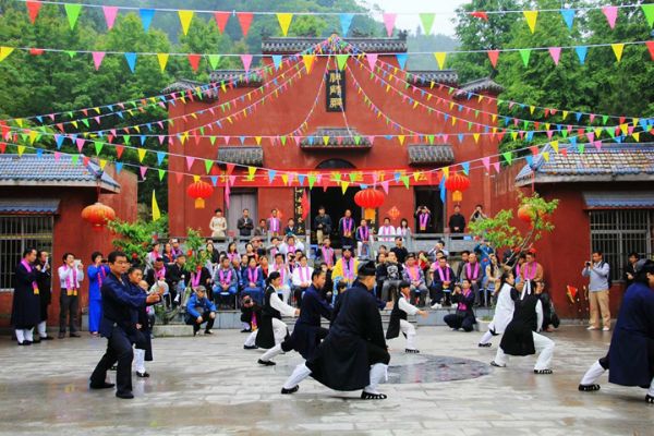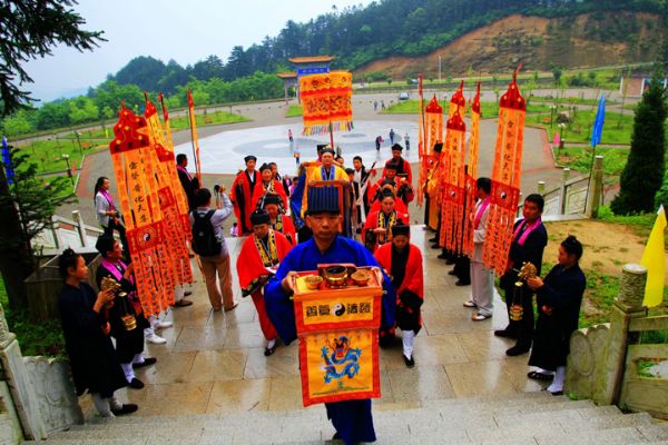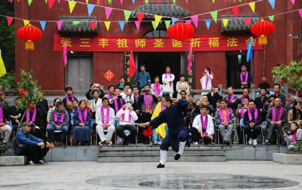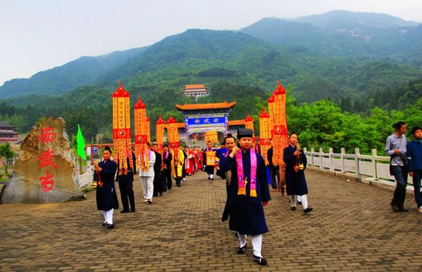 农历四月初九,是武圣张三丰圣诞的大喜日子。只见南武当道院彩旗飘杨,幢幡高挂,经忏声声,檀香缥缈,到处洋溢着一片节日的气氛。 由南武当山道教协会主办,湖北大别山主峰(南武当)风景区协办的张三丰圣诞祈福大法会在南武当山祖师殿举行。来自北京,贵州,湖南,广东,四川,武汉,十堰,黄冈十几个省市的武当弟子,信徒,护法居士及当地政府和主管部门领导,信众 数百人参加了法会。法会开幕式由南武当道教协会副会长周理参主持,大别山主峰(南武当)风景区主任方汇文致欢迎词。南武当山道教协会会长游玄德道长在开坛仪式上讲话。游道长说;道教是中华民族的国教,我们要响应国家主席习近平倡导的"人民有信仰,国家就有希望⋯"的号召,为国家战略一带一路祈祷,为民族复兴祈福,为十方护法弟子健康平安祈福,为万民祈祷! 这次法会于四月初八晚上八点开坛,由黄冈市道教协会秘书长周信崇带领的经师团拜祝寿科仪。然后由游玄德大师讲法,给弟子和信众作开示。初九早上5点集体朝拜武圣宫。早晨七点从瑶池武当道院出发,洒净水,阅庙,巡游。巡游队伍抬着锣鼓,手举挂幡,敲着大鼓,经声洪亮,震撼了整个山谷。再现了乾隆下江南之盛况。 上午九点正式举行祈福法会。法会后举行庄严的拜师仪式。著名书法家周强,马鞍山市商会副会长汤忠凤等五位艺术界,商界人士成为武当派的新生力量。 中午,在武当道院举行了感恩演武大会。多次荣获国家武术大赛金奖的周理参,游小龙,游尊龙,李理浩及武当小弟子们表演了精彩的武当拳,武当剑,太乙拂尘,太极刀,赢得了阵阵掌声。