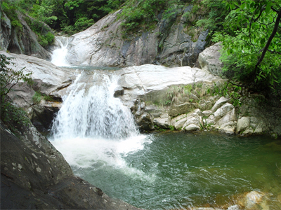 河床岩体由几组平行断裂带发生位移,加之流水冲刷而成。分为上下两潭,上潭为月牙形,下潭为圆形,潭水碧绿,波影摇光,深不见底,上下两潭瀑水相连,故名日月潭。