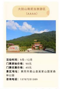 为助力我市文旅产业复苏,2021年9-12月,英山大别山南武当旅游区实行半价酬宾活动,其中的“中秋节”和“国庆节”两个小长假期间本旅游区仍实施半价优惠,热忱欢迎广大游客朋友来景区同庆中秋,欢度国庆。[ 查看更多 ]
